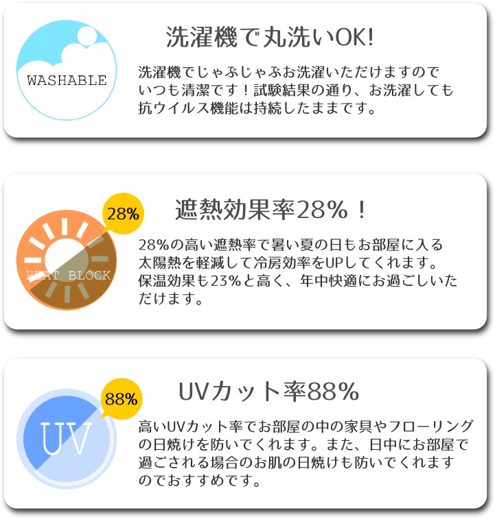 遮熱機能、保温機能、遮像機能、UVカット、ウォッシャブル機能付きで、お手入れ簡単!