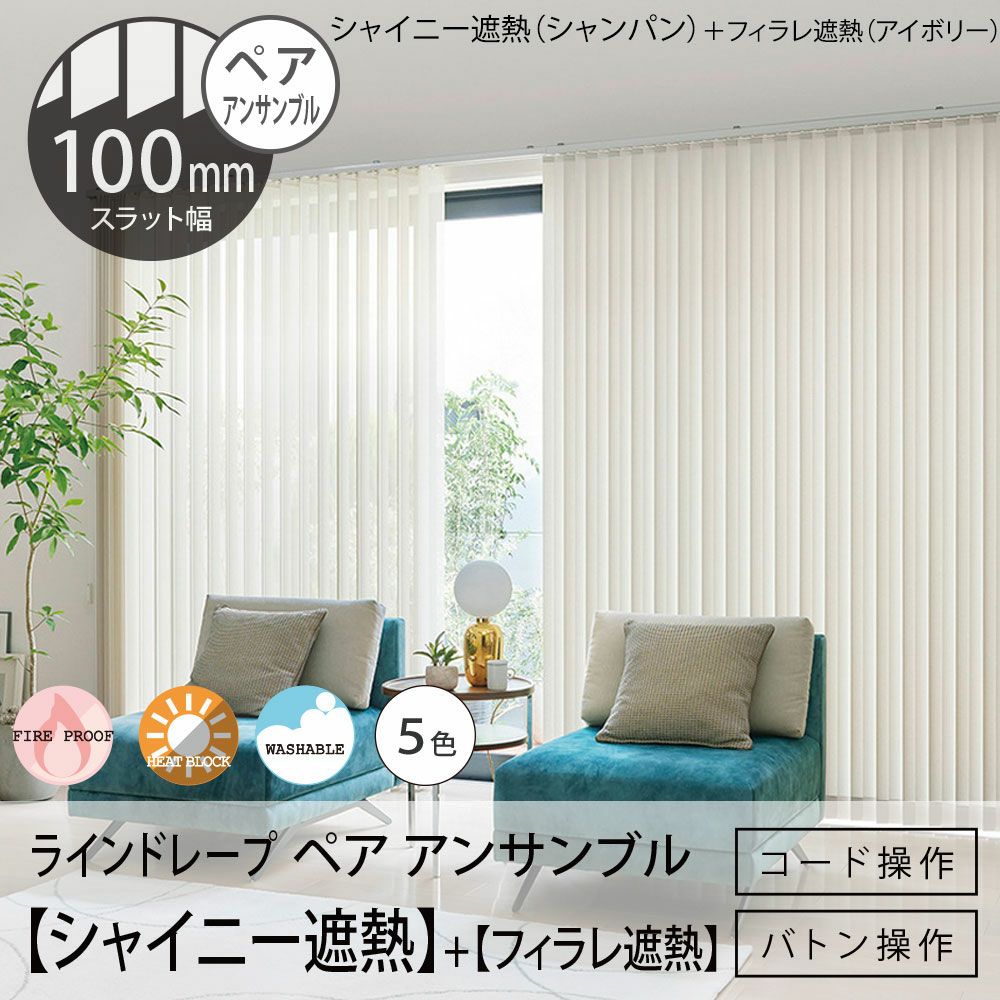 他の画像を見る 非遮光 防炎 ミラー UVカット 代引不可 日本製・1台2役・厚地とレースが遮熱生地でさらに快適に タテ型ブラインド<ラインドレープ ペア アンサンブル>【マカロンラテ遮熱+フィラレ遮熱】100mm幅(バトン操作・コード操作)※代引不可 販売価格 ¥ 40,040 税込 【LINE DRAPE - ラインドレープ】厚地9色とレース5色から選べる2種類の遮熱生地でさらに快適。お買い得な縦型ブラインド<マカロンラテ遮熱+フィラレ遮熱>ペア アンサンブル・100mm幅 詳細を見る お気に入りに登録する
