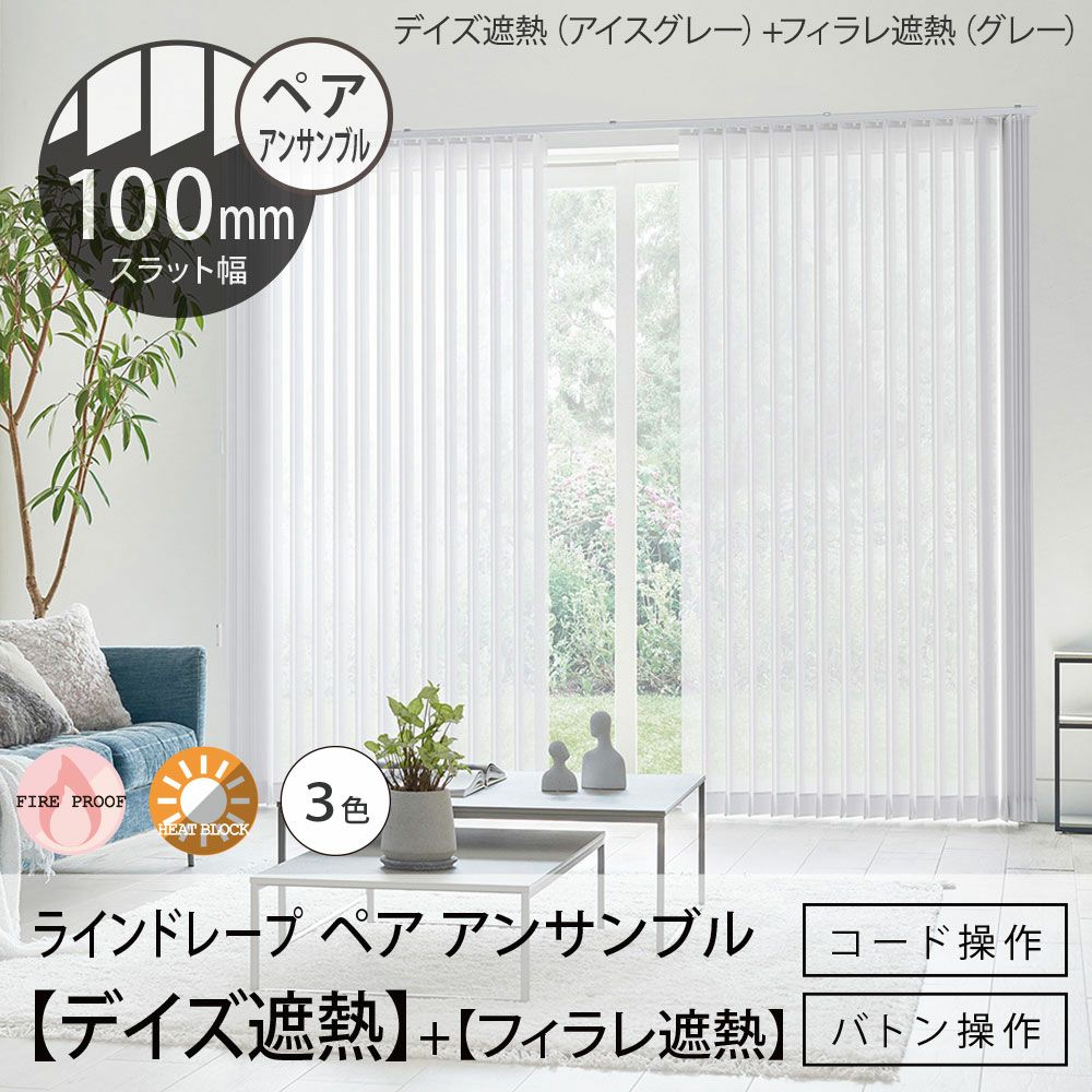 他の画像を見る 非遮光 防炎 ミラー UVカット 代引不可 日本製・1台2役・厚地とレースが遮熱生地でさらに快適に タテ型ブラインド<ラインドレープ ペア アンサンブル>【デイズ遮熱+フィラレ遮熱】100mm幅(バトン操作・コード操作)※代引不可 販売価格 ¥ 44,660 税込 【LINE DRAPE - ラインドレープ】再生ポリエステル使用の遮熱生地3色×レース15色・厚地もレースも遮熱生地で省エネ!お買い得な縦型ブラインド<デイズ遮熱+フィラレ遮熱>ペア アンサンブル・100mm幅 詳細を見る お気に入りに登録する