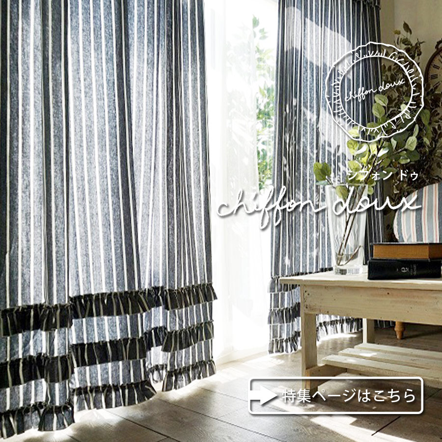 びっくりカーテンのプライベートラベル「CHIFFON DOUX-シフォン ドゥ-」は、天然素材の生地にフリルやリボンを使って女性らしい空間をご提案致します。