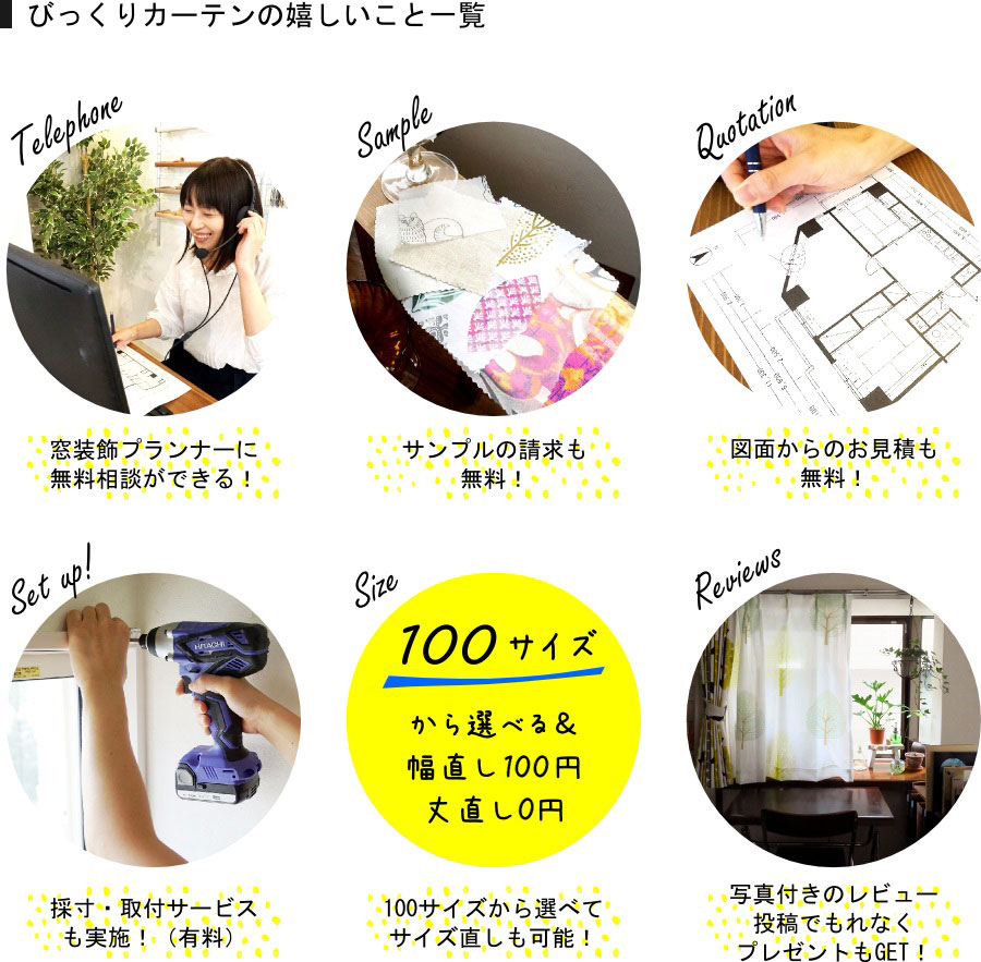 | また、他にも沢山のサービスで、カーテン選びをがっちりとサポートさせていただいております!! 中でも、フリーダイヤルに電話すれば、知識豊富なスタッフが親身に相談に乗ってくれるのが嬉しいポイント( *´艸`) 窓装飾プランナーの資格保有者が図面を見ながら的確にサイズ出しやアドバイスもしてくれるんです♪ サービスは、最大限利用して、良いお買い物をしたいですよね! |