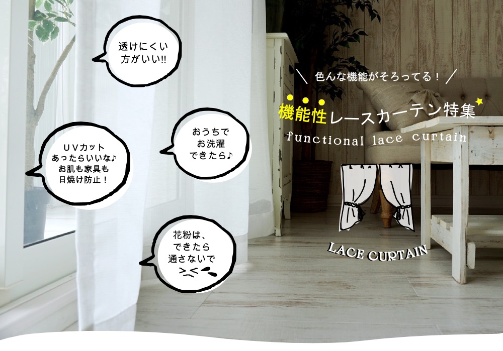 びっくりカーテンのプライベートブランドから、おしゃれなのに機能性も高いレースカーテンをご用意しました。