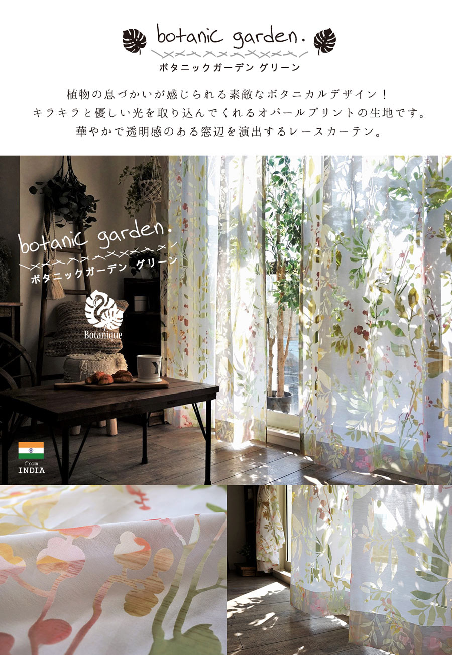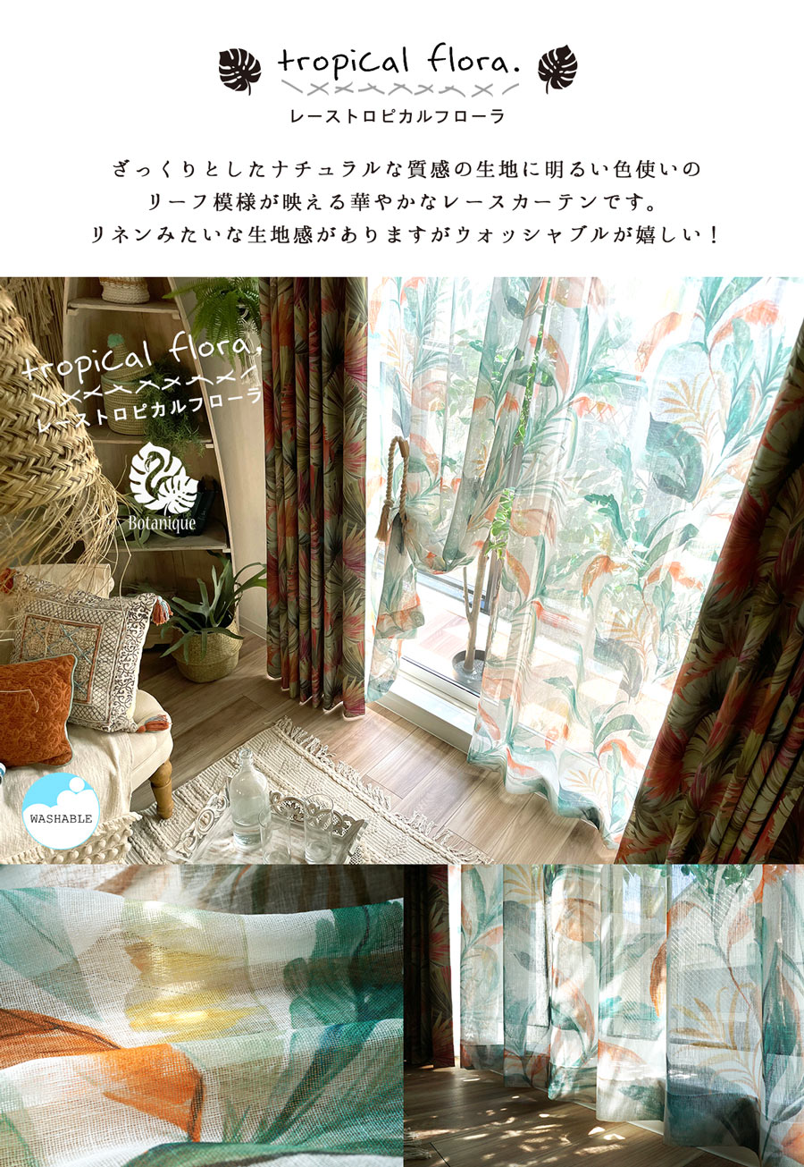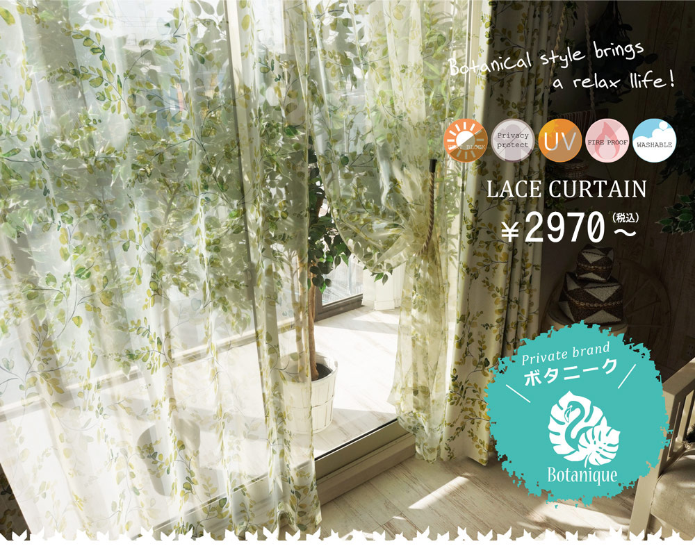 【 BOTANIQUE-ボタニークシリーズ- 】レースカーテン特集 ボタニカルなリラックスコーディネートをもっとお楽しみいただきたい!とおすすめのインテリア雑貨をたくさんご用意いたしました。カーテンと一緒に取り入れていただくとお部屋の雰囲気ががらりと変わります! リラックススツール クッションカバー ボタニカルな照明 マストアイテム!インテリアグリーン バリ直輸入!ウッドオブジェ バリ直輸入!インテリアフレーム バリ直輸入!ビーズバスケット バリ直輸入!マクラメウォールデコ ▼こちらもおすすめ!川島織物セルコン様と共同開発したオリジナルジョイントラグ! ▼当店オリジナルデザインのルームシューズ・スリッパ特集! ↓ ↓ こちらもコーディネートにおすすめのバリ島インテリア雑貨です! 機能性重視、デザイン重視の2タイプの商品をご用意いたしました。ご希望に合わせてお好みのカーテンをお選びください! オリジナルデザイン&機能タイプ商品の特徴と仕様はこちら!商品により備えている機能が異なりますので、各商品ページの商品詳細にて個別にご確認ください。 ※<レーストロピコ>のみ防炎機能があります。 インポート生地ならではの大胆なデザインが他にはない商品です。 ▼厚地カーテンもご用意しました!こちらからご覧いただけます。 ボタニカル(94)