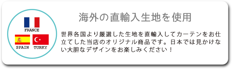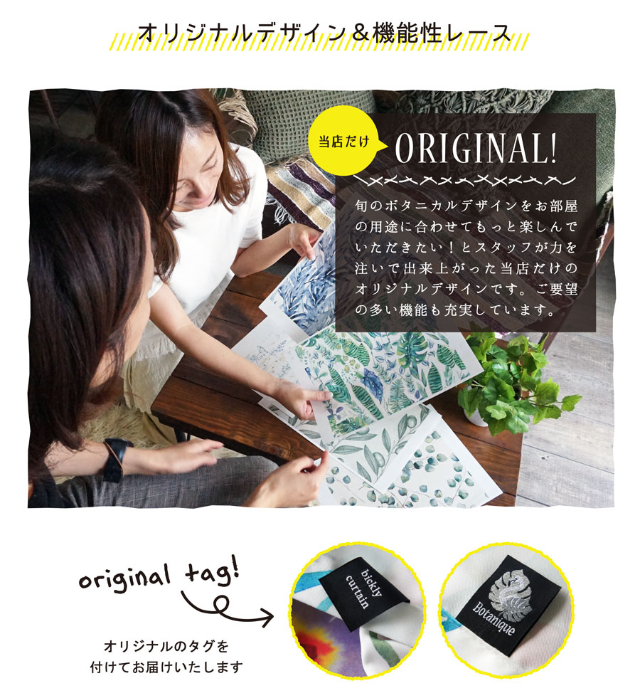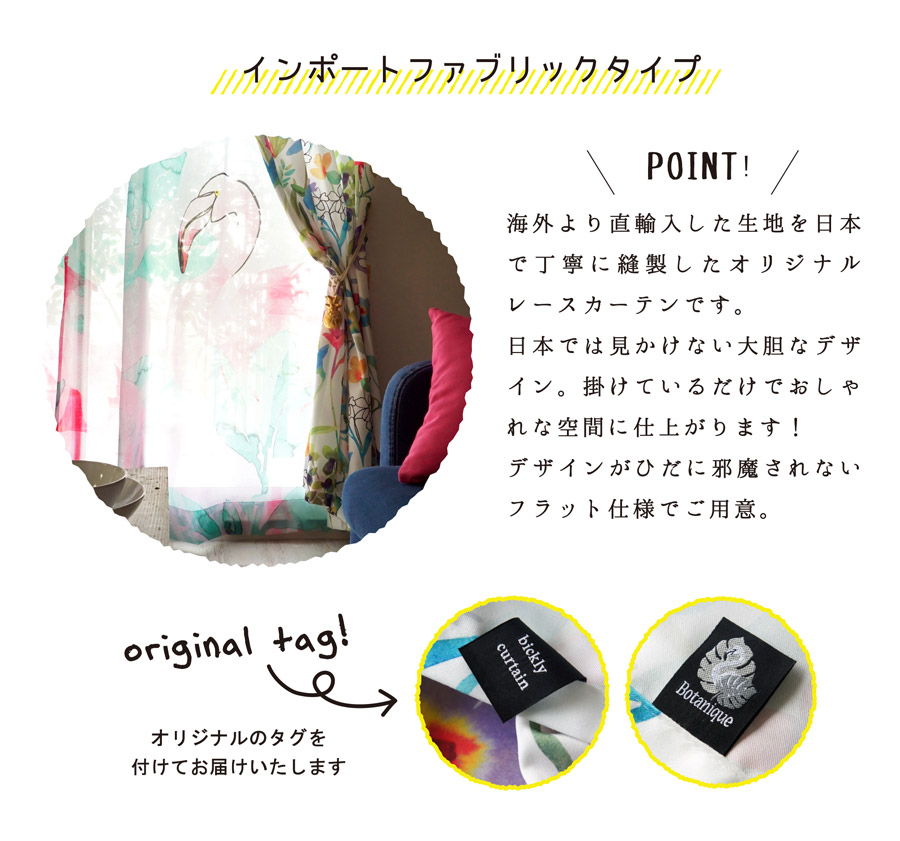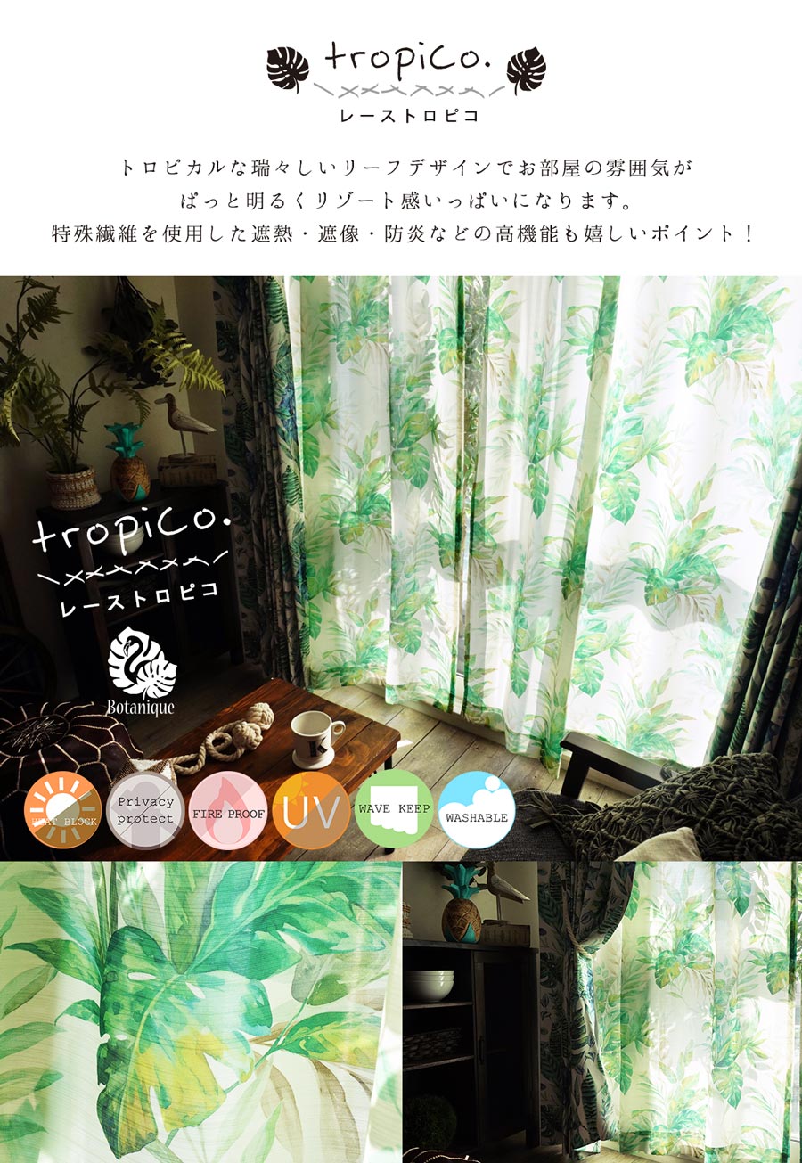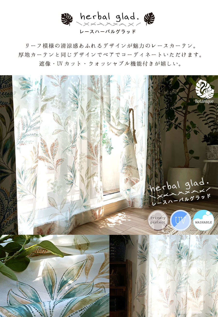 【 BOTANIQUE-ボタニークシリーズ- 】レースカーテン特集 ボタニカルなリラックスコーディネートをもっとお楽しみいただきたい!とおすすめのインテリア雑貨をたくさんご用意いたしました。カーテンと一緒に取り入れていただくとお部屋の雰囲気ががらりと変わります! リラックススツール クッションカバー ボタニカルな照明 マストアイテム!インテリアグリーン バリ直輸入!ウッドオブジェ バリ直輸入!インテリアフレーム バリ直輸入!ビーズバスケット バリ直輸入!マクラメウォールデコ ▼こちらもおすすめ!川島織物セルコン様と共同開発したオリジナルジョイントラグ! ▼当店オリジナルデザインのルームシューズ・スリッパ特集! ↓ ↓ こちらもコーディネートにおすすめのバリ島インテリア雑貨です! 機能性重視、デザイン重視の2タイプの商品をご用意いたしました。ご希望に合わせてお好みのカーテンをお選びください! オリジナルデザイン&機能タイプ商品の特徴と仕様はこちら!商品により備えている機能が異なりますので、各商品ページの商品詳細にて個別にご確認ください。 ※<レーストロピコ>のみ防炎機能があります。 インポート生地ならではの大胆なデザインが他にはない商品です。 ▼厚地カーテンもご用意しました!こちらからご覧いただけます。 ボタニカル(94)