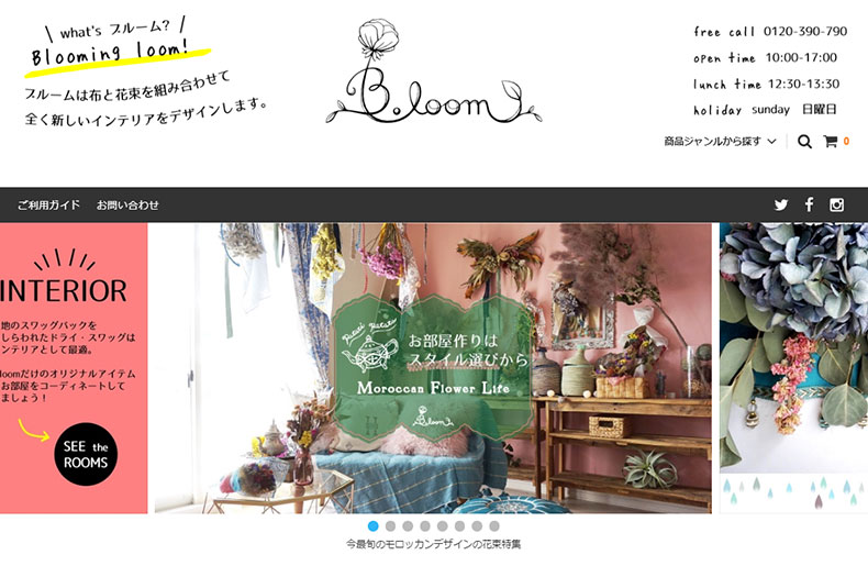 ファブリクス(LOOM)と花々(BLOOM)を組み合わせて全く新しいインテリアの形B.loom(ブルーム)をデザインするライフスタイルショップとなっております。
