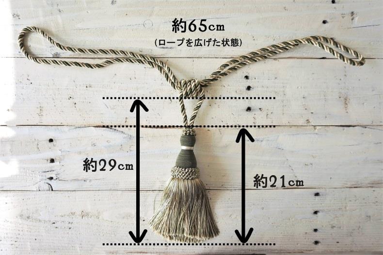 例えば下記タッセル【モーメント】はロープ部分(広げた状態で)約65センチ、房部分は約21センチあります。
