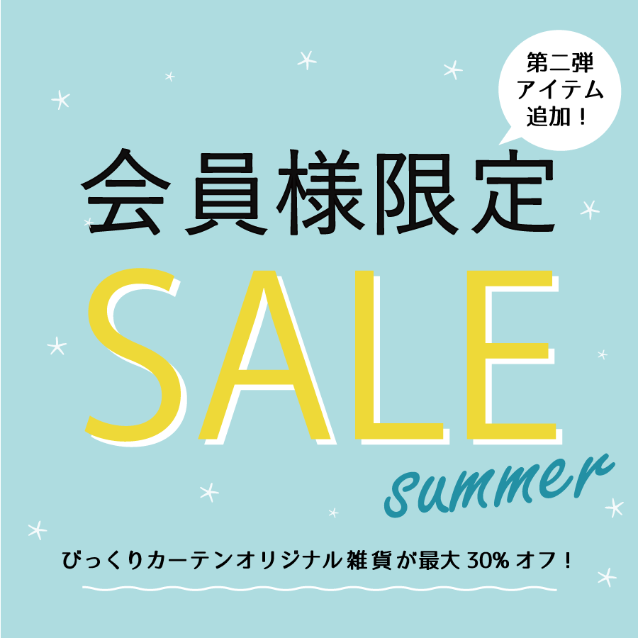 いつもびっくりカーテンをご利用いただきありがとうございます! 大好評の会員様限定セールに、新しく商品を追加させていただきました。前回に引き続き今回も夏におすすめの商品です。 お気に入りを見つけて、素敵なお部屋で暑い夏を乗… 続きを読む 【会員様限定】特別セール第三弾 開催中です!