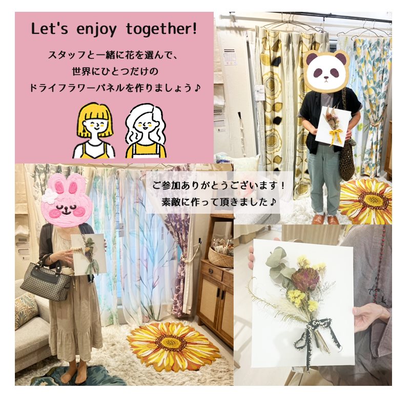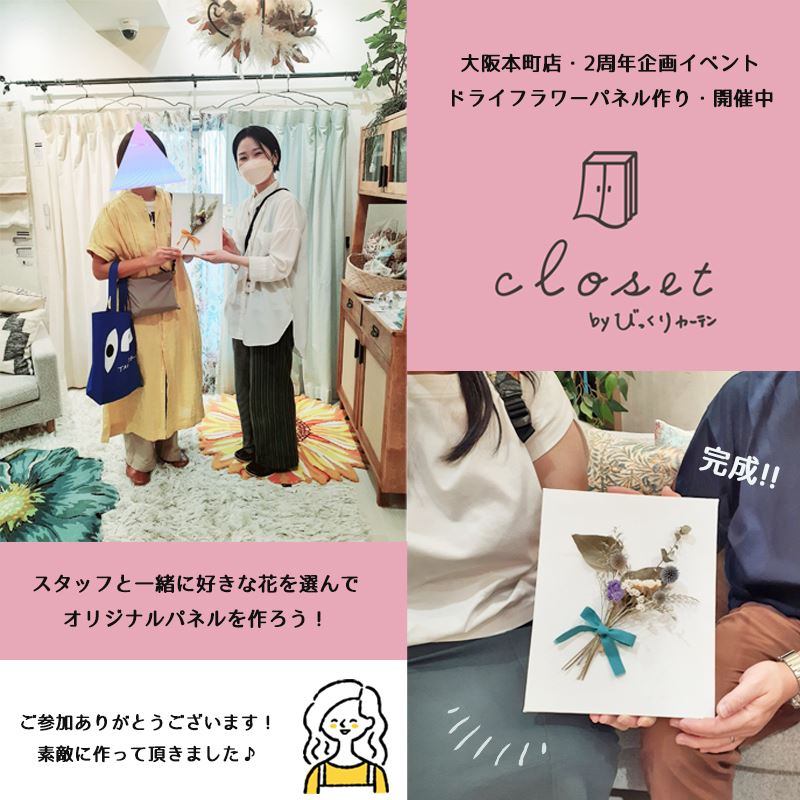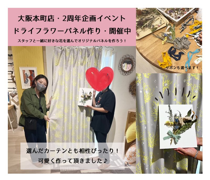 大阪本町店・2周年企画イベント -スタッフと一緒に好きな花を選んでオリジナルパネルを作ろう!- ドライフラワーパネル作り・開催中です(*^-^*) 先週よりスタートしました、2周年企画イベント… 続きを読む びっくりカーテンcloset大阪本町店・2周年企画イベント開催中です♪