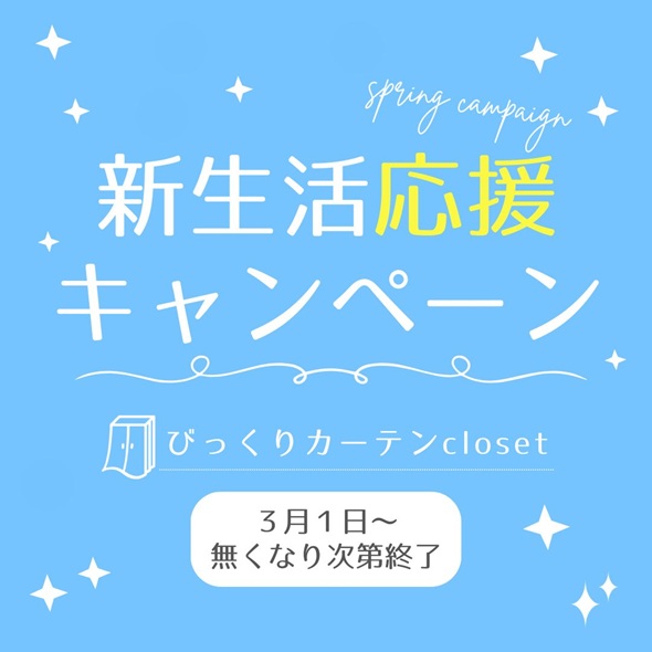 こんにちは!びっくりカーテンcloset吉祥寺店です。今回は季節にちなんだ、嬉しいキャンペーンのお知らせでございます♪ 3月4月と言えば暦の上でも『春』でございますが、春と言えばそう、お引越しのシーズンにあたりますね。新… 続きを読む ~びっくりカーテンcloset 春の新生活フェア~【吉祥寺店】