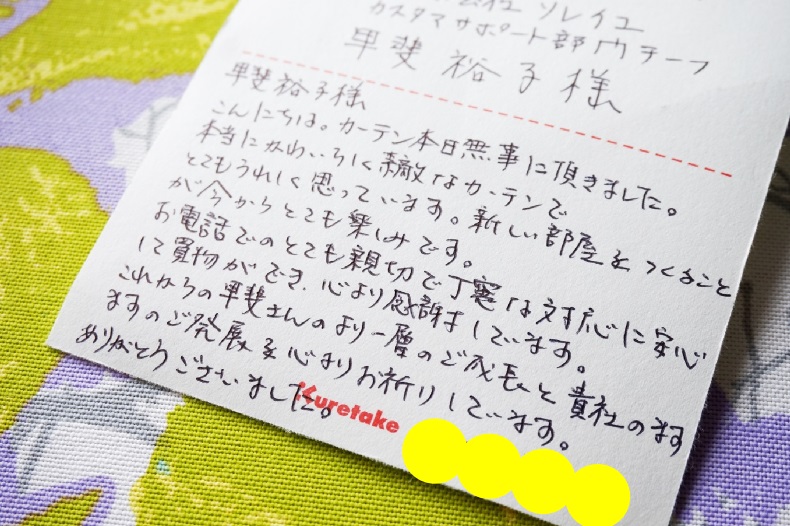 ぴったりのカーテンをお届けすることができ、また、商品にも、甲斐の接客にも大変ご満足いただけたようで、