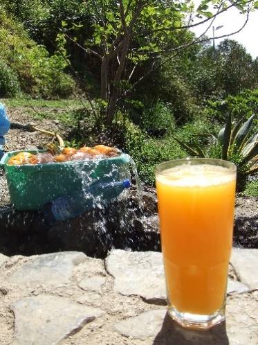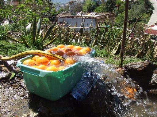 彼らは湧水からでてくる冷たい水を直接ホースから引いて、タライの中にオレンジをプカプカと浮かべて、