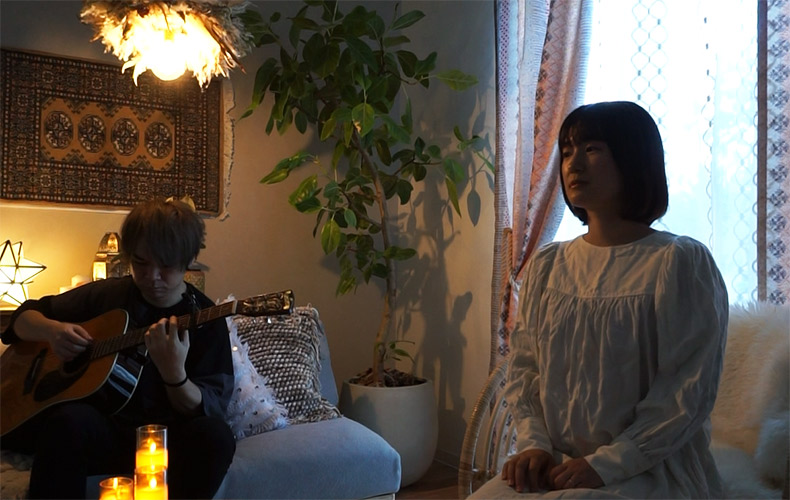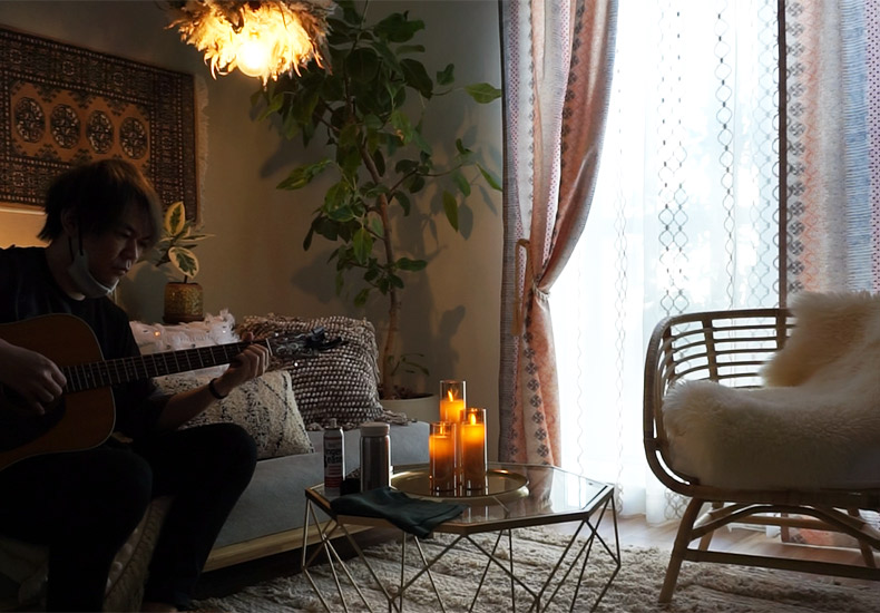 アコギ担当Michimotoが座るソファもしっかり華やかに飾ります!