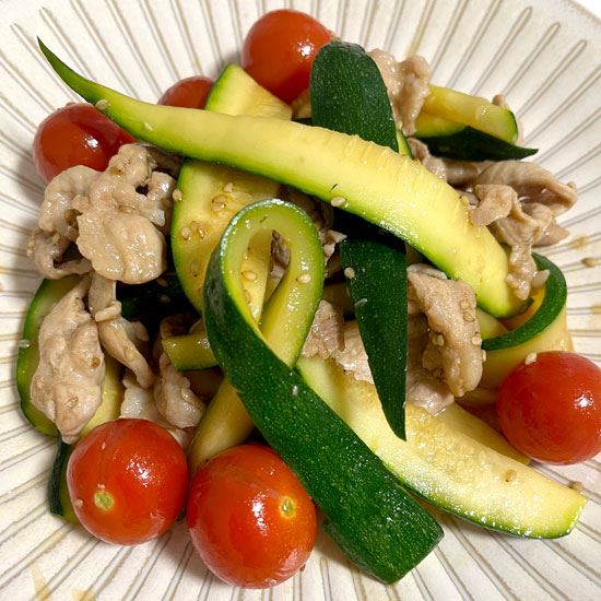 屋上でとれたトマトを使って「トマトとズッキーニと豚肉のオイスターソース炒め」を作りました。