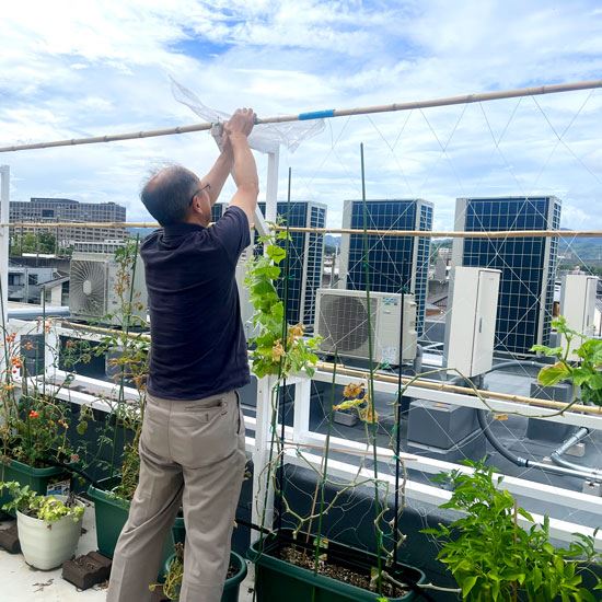 台風の影響でびっくりカーテンのある大阪も天気が悪く、園芸部が活動している屋上もいつもに増して風が強いです。