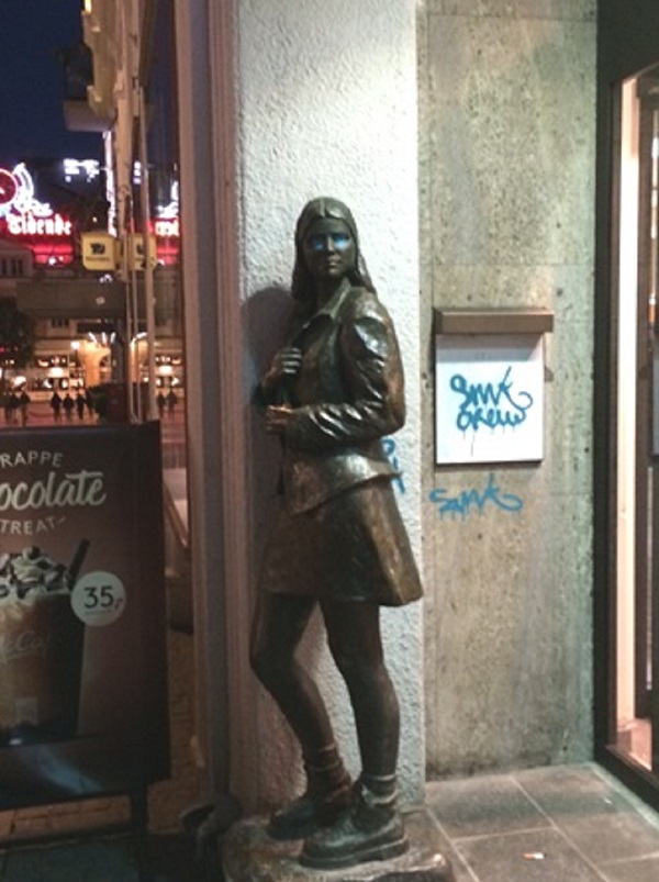 北欧では公園や広場などいたるところに銅像がありますが、なぜかファストフード店前に。。