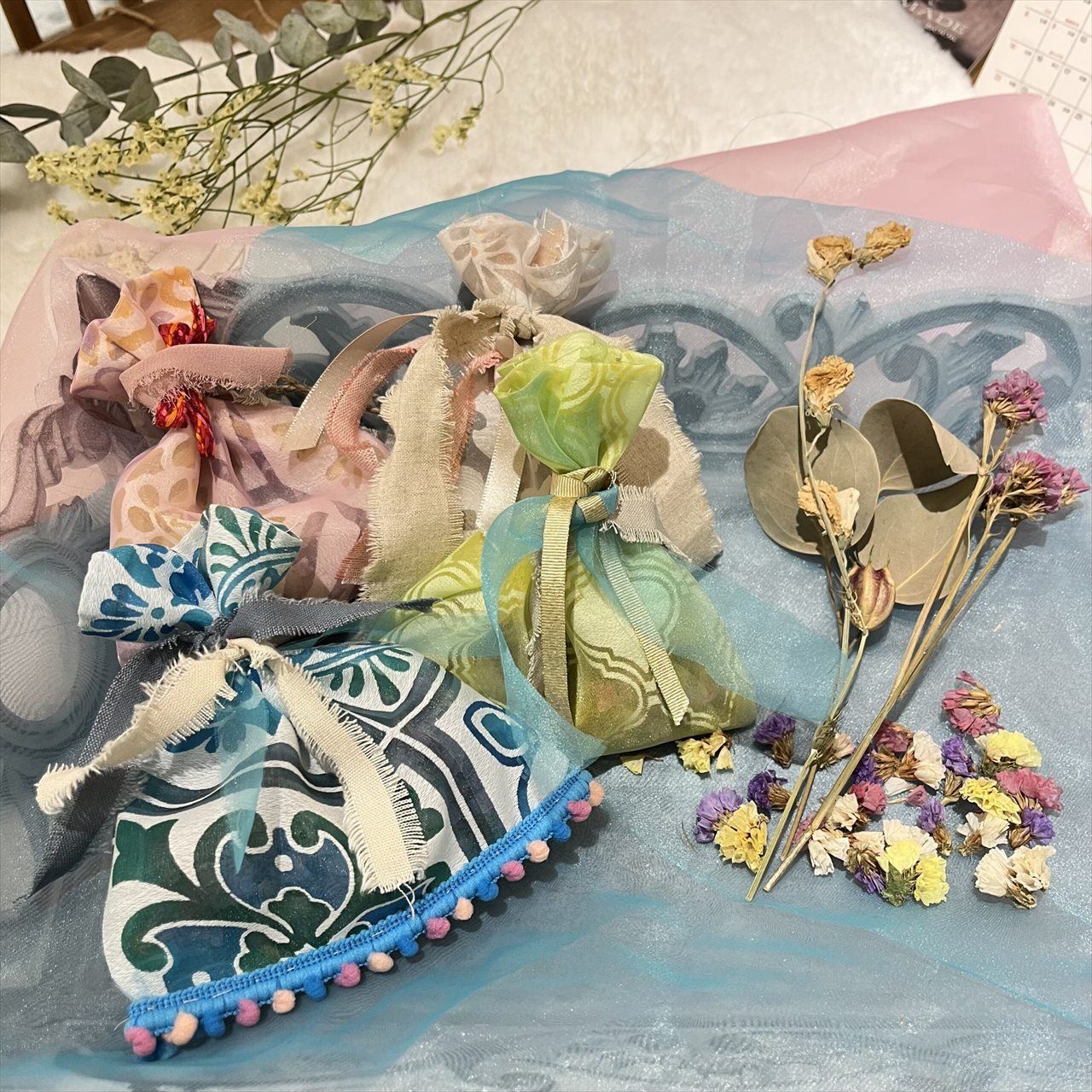 ・香りをつけたドライフラワーを当店のカーテン生地で作った袋に入れ、