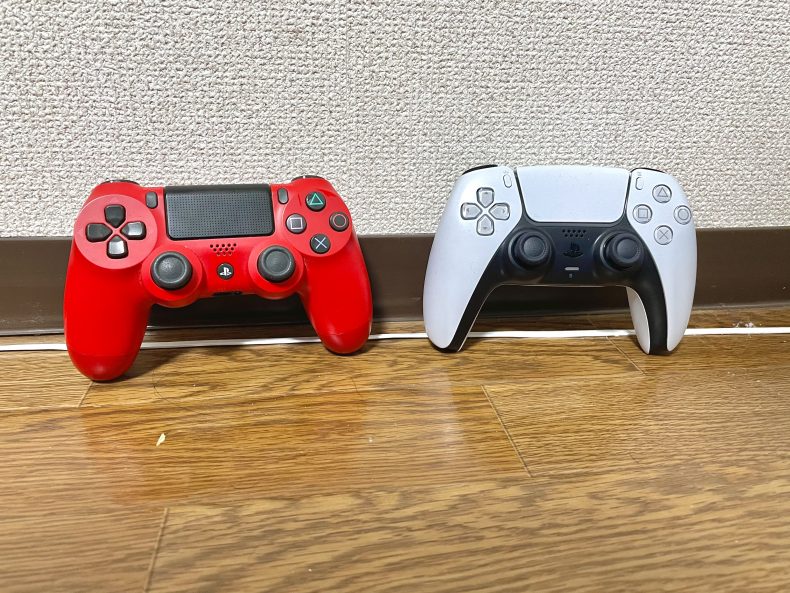 コントローラーは左のPS4と比較しほんの少し大きくなり、振動が強弱が細かくなったり左右で違う振動をしたりときめ細かく調整されるようになり、