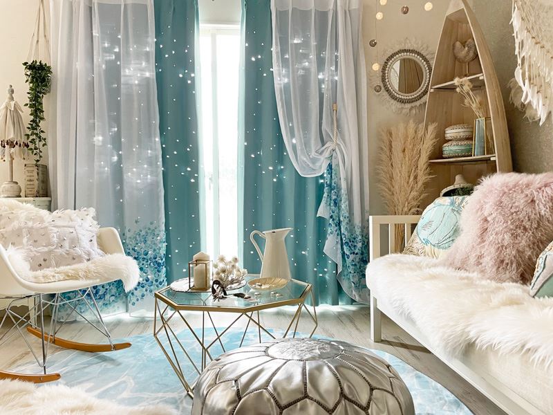 デニムのような素材感の生地に星柄がデザインされたカーテン×透け感ある星のレース