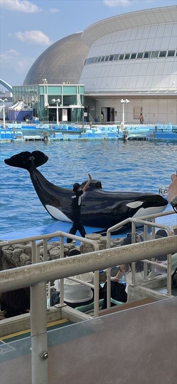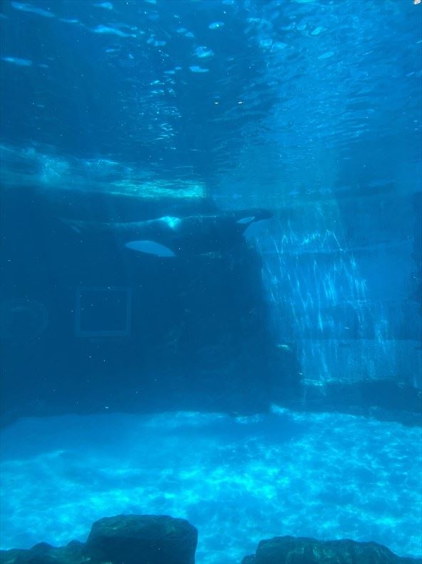 入口からシャチの特大水槽がお目見え&シャチのショーでパシャリ。