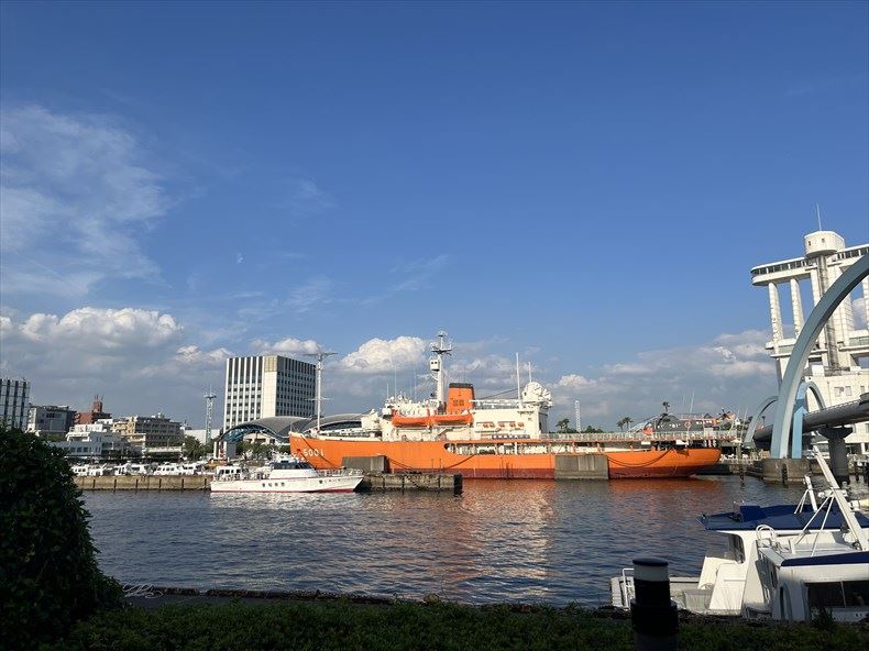 一緒に映り込んでいるのは南極観測船のふじです。本格的な砕氷艦としては日本で最初の船なんですって。