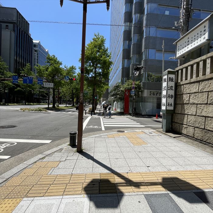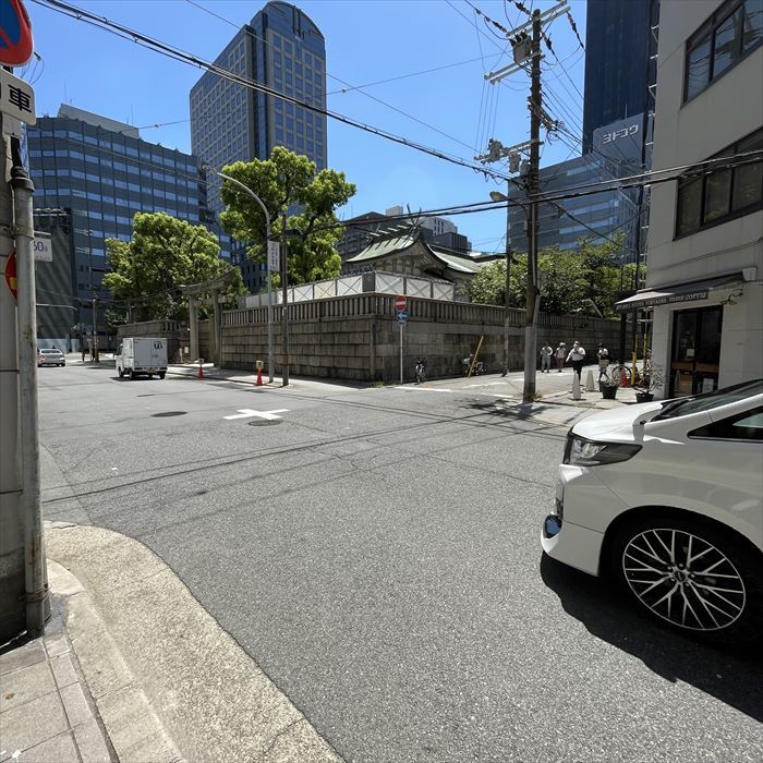博労町3丁目は交差点、難波神社とフェラーリのショールーム(コーンズ大阪ショールーム様)の間を曲がります。