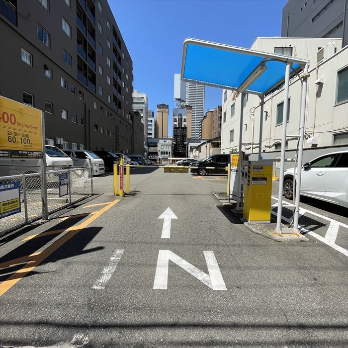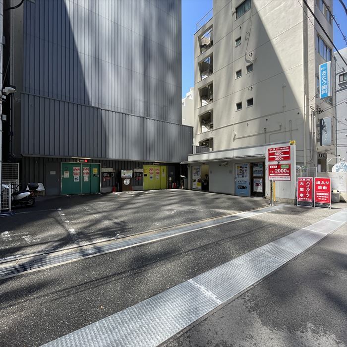 難波神社とフェラーリの間の交差点(博労町3丁目交差点)の次の角を右折していただくとある駐車場です。
