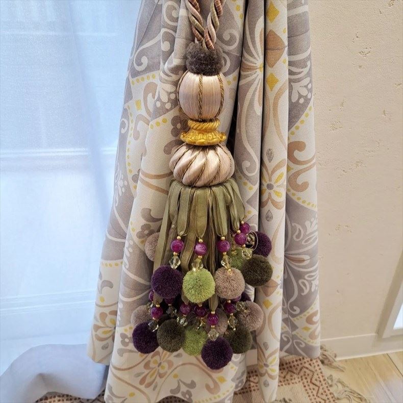 カーテンは落ち着いたカラーで組み合わせたのでタッセルは遊び心のあるものを選びました。