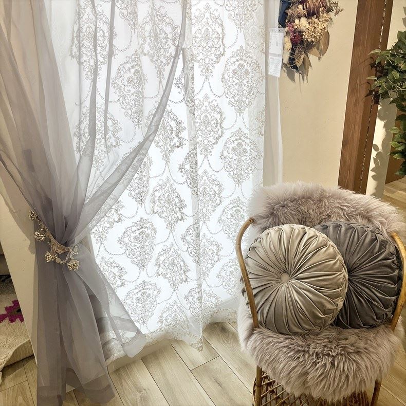 後ろの「レースジュディ」はオーガンジー生地にラメ糸の刺繍を施したレースカーテン。