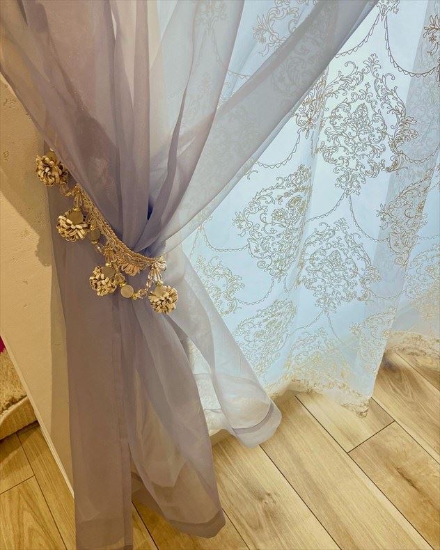 ラメ糸がキラキラとしている厚地カーテンに、裾がスカラップでおしゃれなトルコ刺繍のレースカーテンを合わせています。