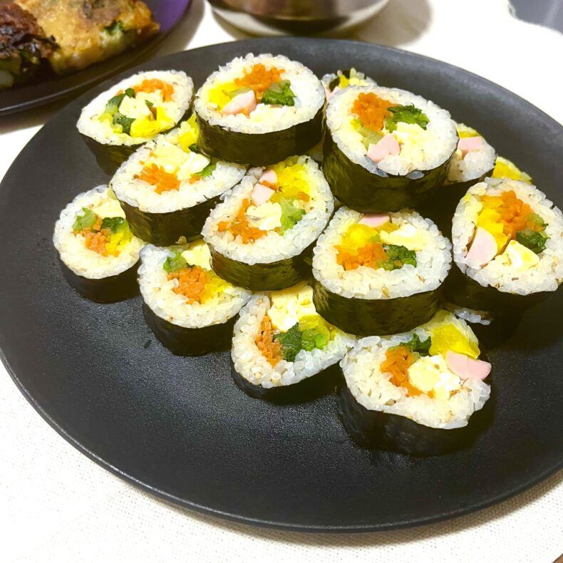 キンパ(韓国海苔巻き)です。日本の海苔巻きとは違ってお酢を入れないタイプが多いようです。