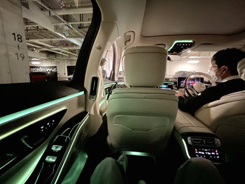 「ヘイ、メルセデス」と言えば音声認識で操作でき、これが今回から全座席で可能となり、反応中は近くのLSDが点滅します。