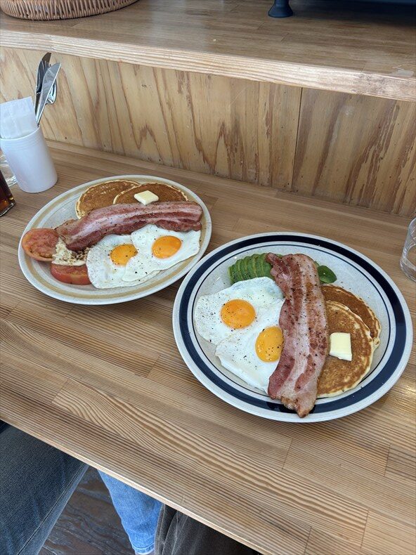 しょっぱい目玉焼きとベーコンに甘いパンケーキ、、美味しくないわけがない組み合わせです(*´ω`*)