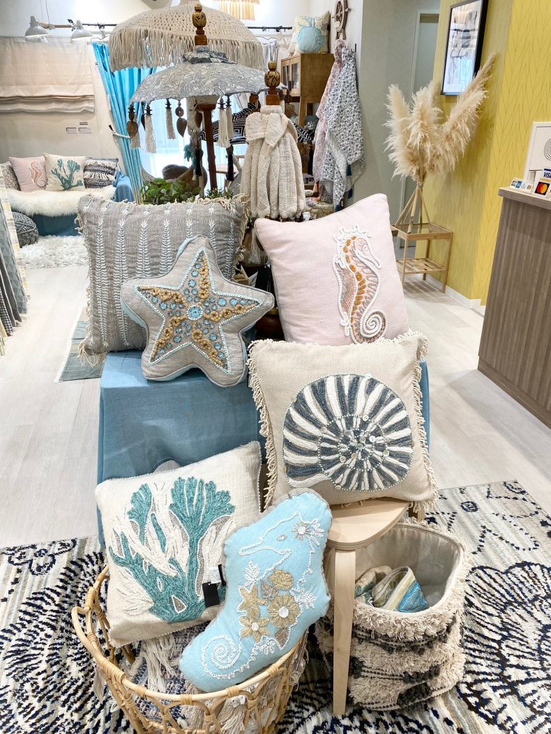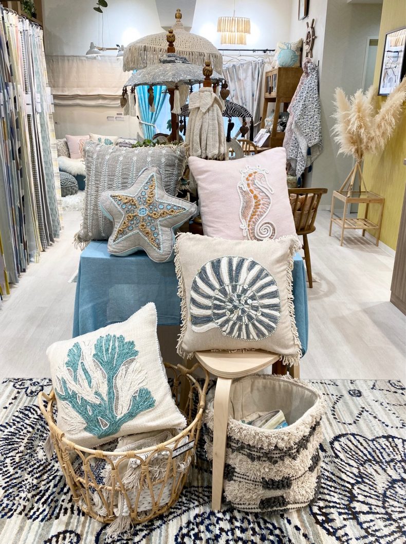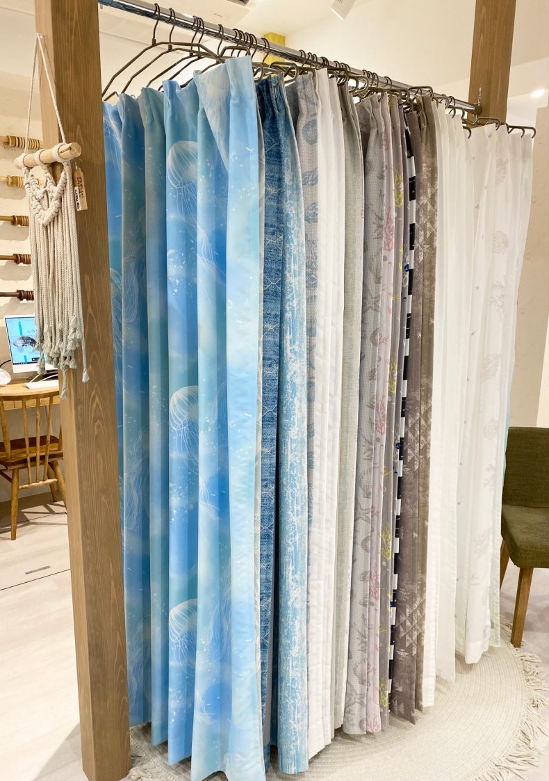 マリン&ピアシリーズのクッションカバーやクラゲさんがユラユラ漂うカーテン、