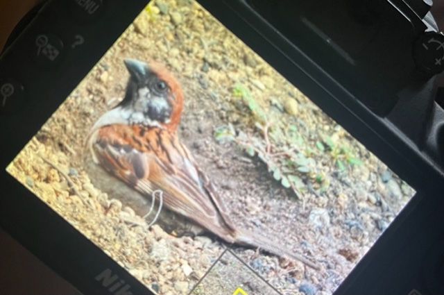 地面に空いた穴にすっぽりはまるスズメです。