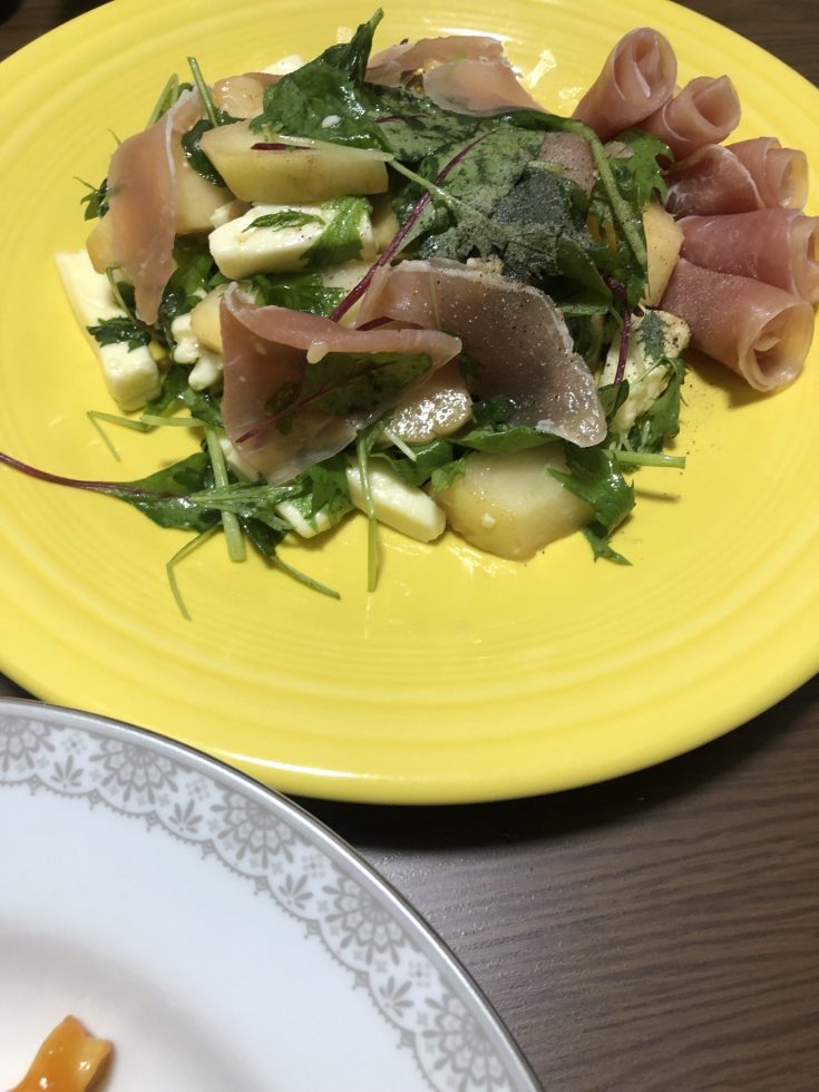 桃と生ハム、モッツァレラチーズやベビーリーフのマリネ。その日一番の後悔はワインを買い忘れたことです。