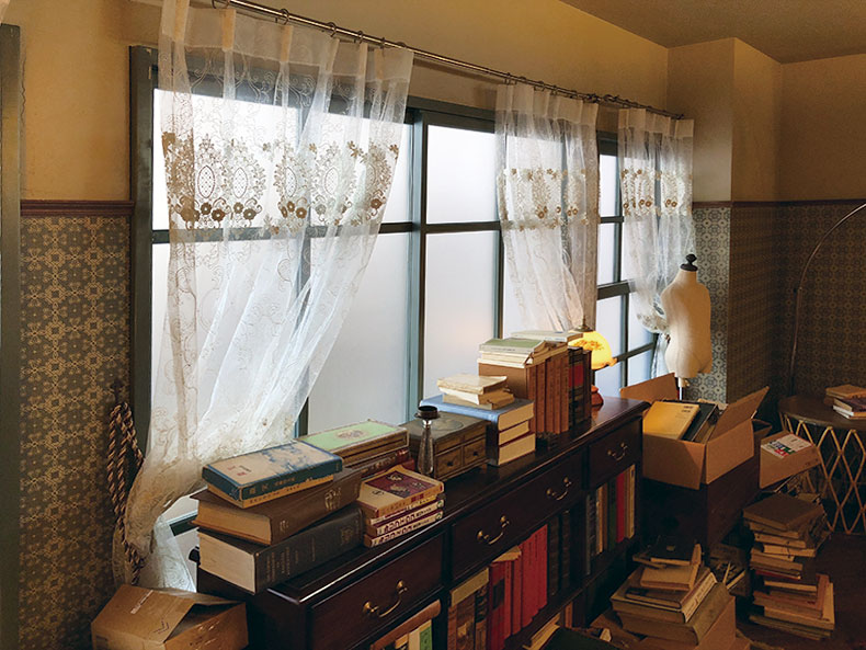 ▼主人公圭佑の妻、奈美の書斎にご採用いただいたのは、当店オリジナルのトルコレースカーテン<チューリー>と当店オリジナルカーテンレール【ANTIQUE BRANCH】の<パレス シルバーサテン>です。
