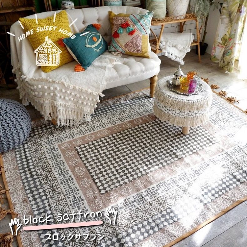 ハンドブロックプリントインドラグ・ナチュラルでおしゃれなデザイン【HOME SWEET HOME】<block saffronブロックサフラン>:3サイズ