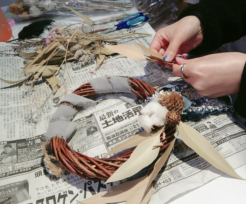 こちらはスタッフがリース作りにチャレンジしているところです(^o^)