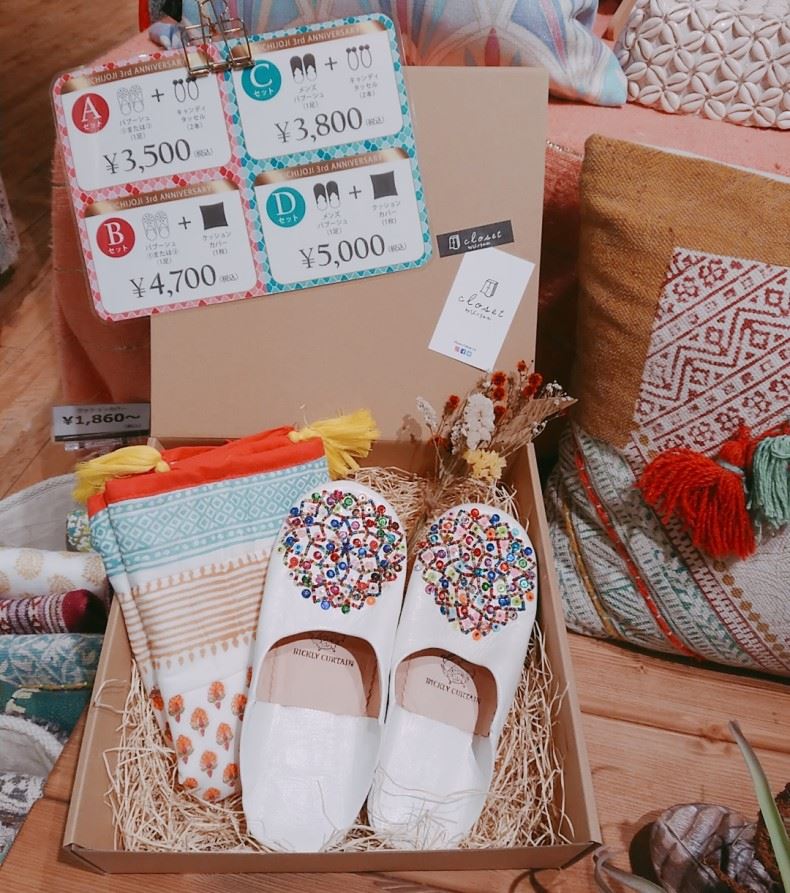 対象商品より、バブーシュやキャンディタッセルの色味、クッションカバーの柄をお選びいただき、