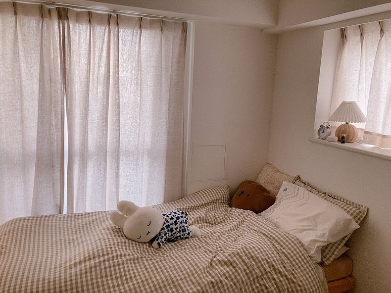 元々フレンチカントリー風のお部屋を目指しリネンの厚地カーテン<パステルリーノ エクリュベージュ>に変えたりベッドカバーも変えてみたり、