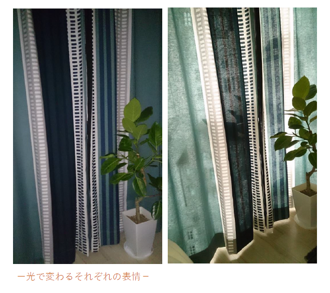 光の加減で~と言えば、非遮光のカーテンも朝と夜では印象が変わります!
