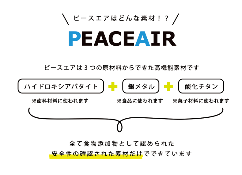 「ハイドロキシアパタイト」「銀メタル」「酸化チタン」といった安全な食品添加物を原料に作られた素材で
