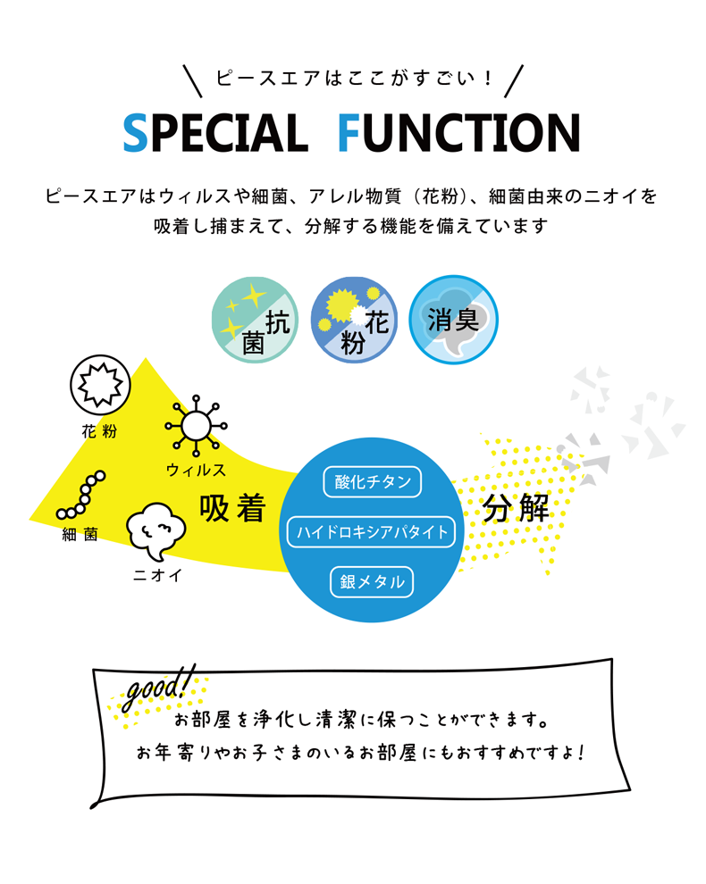 空気中のウイルス・最近アレル物質を吸着して捕まえ、分解してしまういう優れモノ。
