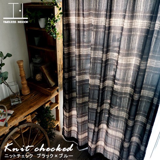 <Timeless Indoor>ウール調の滑らかな質感のチェックカーテン<ニットチェック ブラック×ブルー>