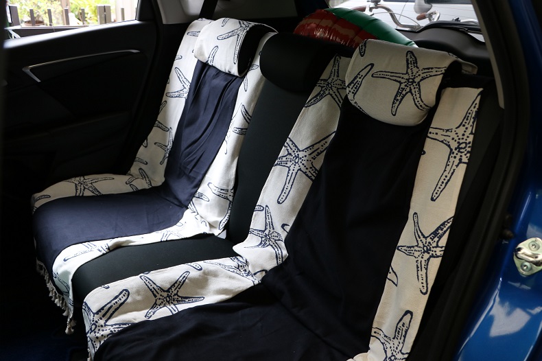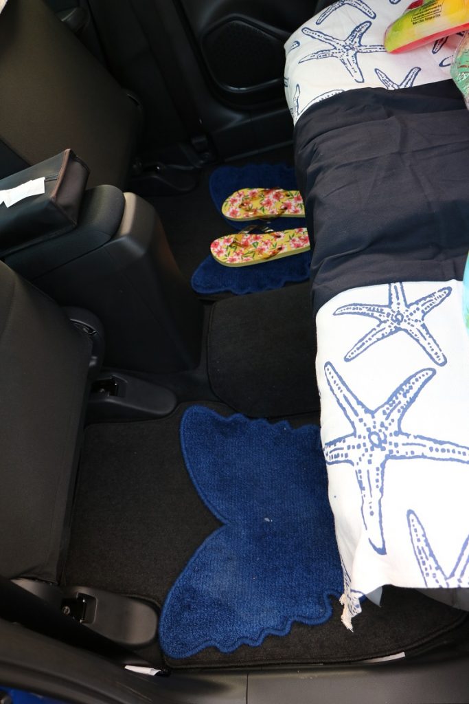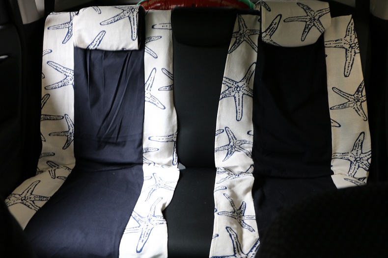下の写真は、リアシートに前座席用のシートエプロンを後ろに付けた様子です。