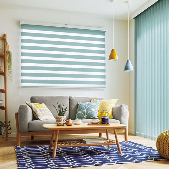 掃き出し窓にはバーチカルブラインド、腰高窓には同じ生地のロールスクリーンにすることで統一感のあるお部屋にすることができますよ!