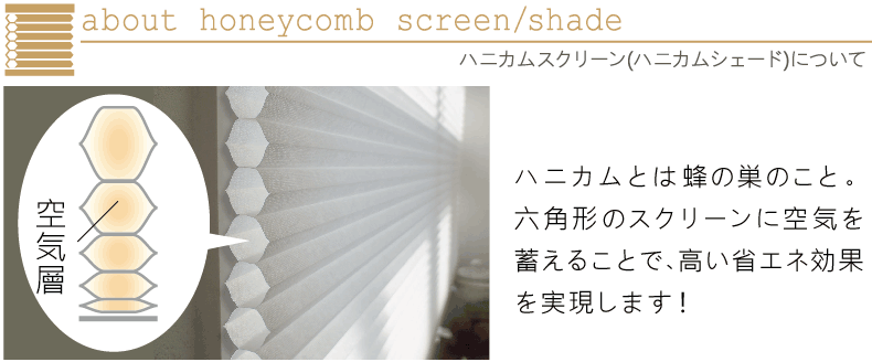 ハニカムとは蜂の巣のことで、生地の断面が六角形になっており、蜂の巣のように見えることからハニカムスクリーンと言います。