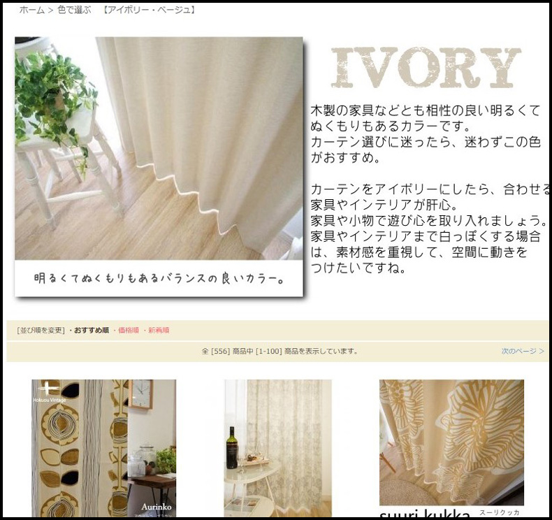 カーテンの色別特集ページ 「色で選ぶ 【アイボリー・ベージュ】」 のページで見ると、レースと厚地を合わせてなんと556件のアイテムがヒットします。