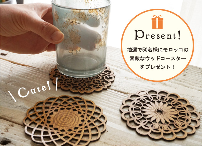当店スタッフがモロッコで直接買い付けた透かし細工のウッドコースター2枚セットをプレゼント!