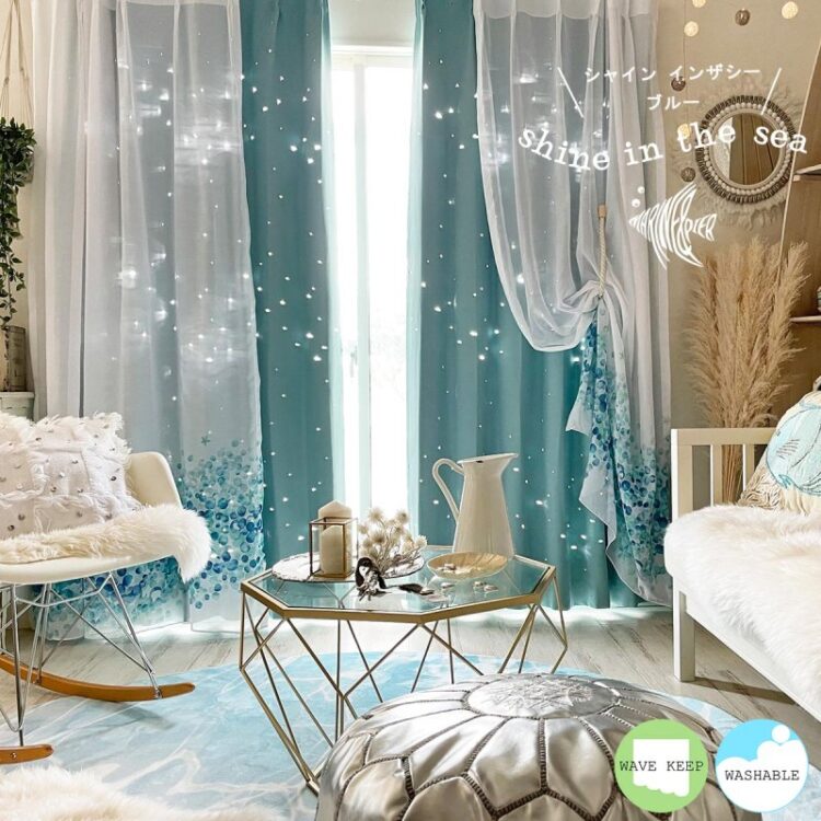 キラキラの光がくり抜きから差し込む厚地カーテンに、波うち際や水中を感じさせるレースのカーテン!